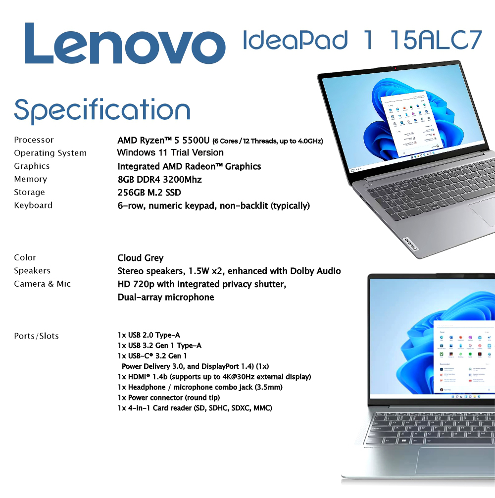 Brand New LENOVO IdeaPad 1 15ALLC7 | RYZEN 5-5500U 2.10GHZ 15" LAPTOP | 8GB DDR4 | 256GB M.2 SSD